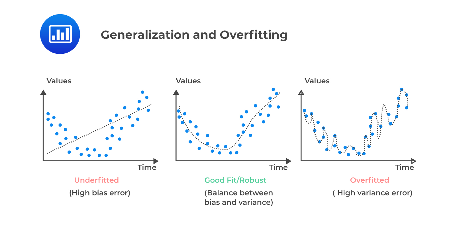 This ensures sufficient data density for discovering meaningful patterns without overfitting. For this afternoon’s example, we will only be using a simple model. The below illustration shows the three different scenarios that can occur based on model complexity when fitting your model.